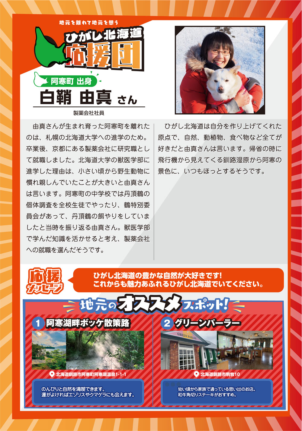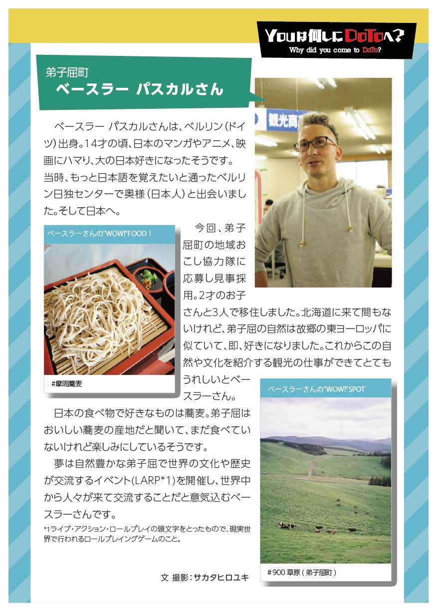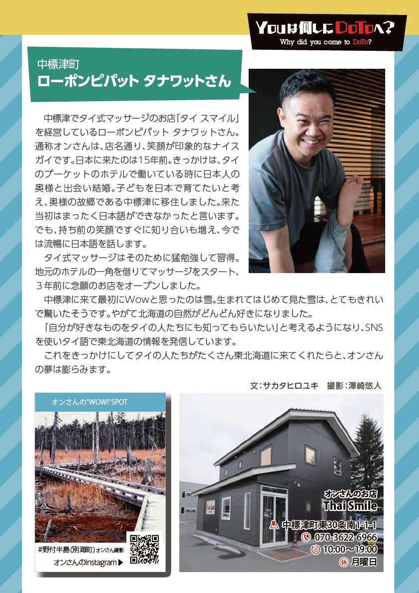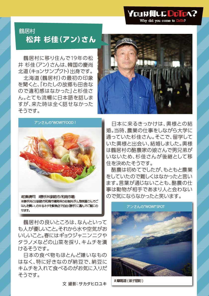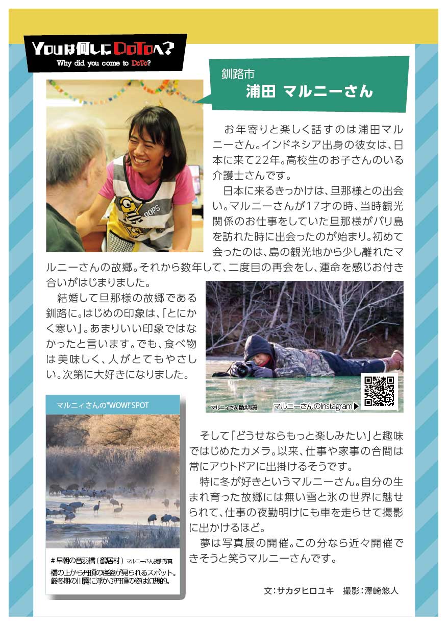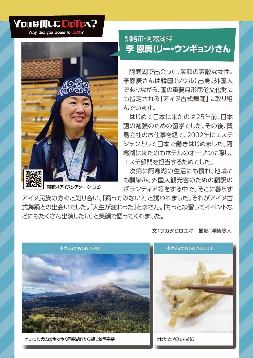 「スミの人NAVI」や「ひがし北海道エンジョイMAP」などの小冊子を通じて特集してきた様々なコーナーで紹介してきた方々をアーカイブ化しました。※クリックすると、記事をご覧いただけます。 ひがし北海道応援団 Youは何しにDOTOへ? 古きを尋ねて新しきを知る 釧路市出身 湊 理徳 思い出の場所は和商市場 弟子屈出身 武井 聡絵 思い出は夏祭りに踊る弟子屈音頭 阿寒町出身 白鞘 由真 ひがし北海道は、自分を作り上げてくれた原点 中標津町出身 エナ ものすごい自然が、当たり前のようにすぐそばにある 浜中町出身 グッチ 故郷の浜中や、釧路の光景を思い出す 釧路市 浦田 マルニー 「寒い」けど「暖かい」そんな釧路が大好き 弟子屈町 ベースラー・パスカル 夢は弟子屈での交流イベント開催 釧路市・阿寒湖畔 リー・ウンギョン アイヌの方々と出会い人生が変わった 中標津町 ローポンピパット・タナワット タイの人たちに自分の好きなものを知ってほしい! 釧路市 ティラック・ピーリス スリランカの健康文化を日本でも 鶴居村 松井 杉佳(アン) 故郷と似ている鶴居村がだいすき 懐かし館・蔵 中野 吉次 地域の文化を集めて 阿寒アイヌ協同組合理事 床 州生 古代舞踊を現在のテクノロジーで表現 朝市の会代表 大石 さくら 地域の遺産に活気と記憶をつなぐ バックナンバー 1 2 3