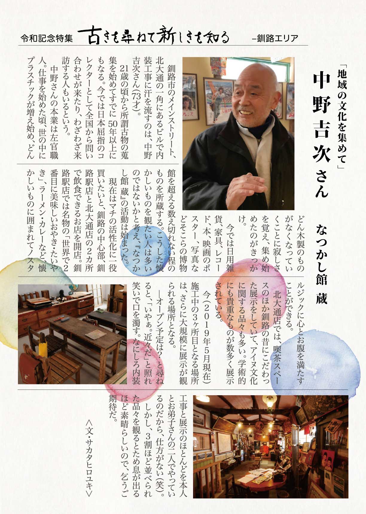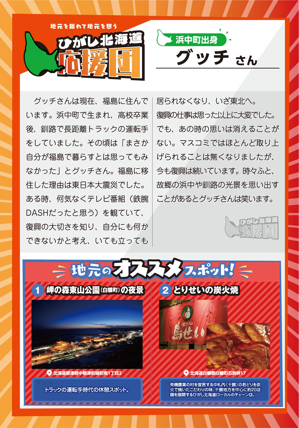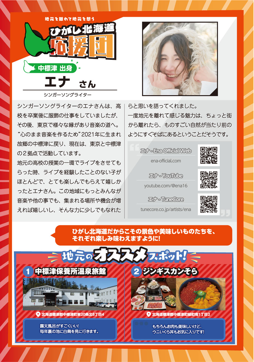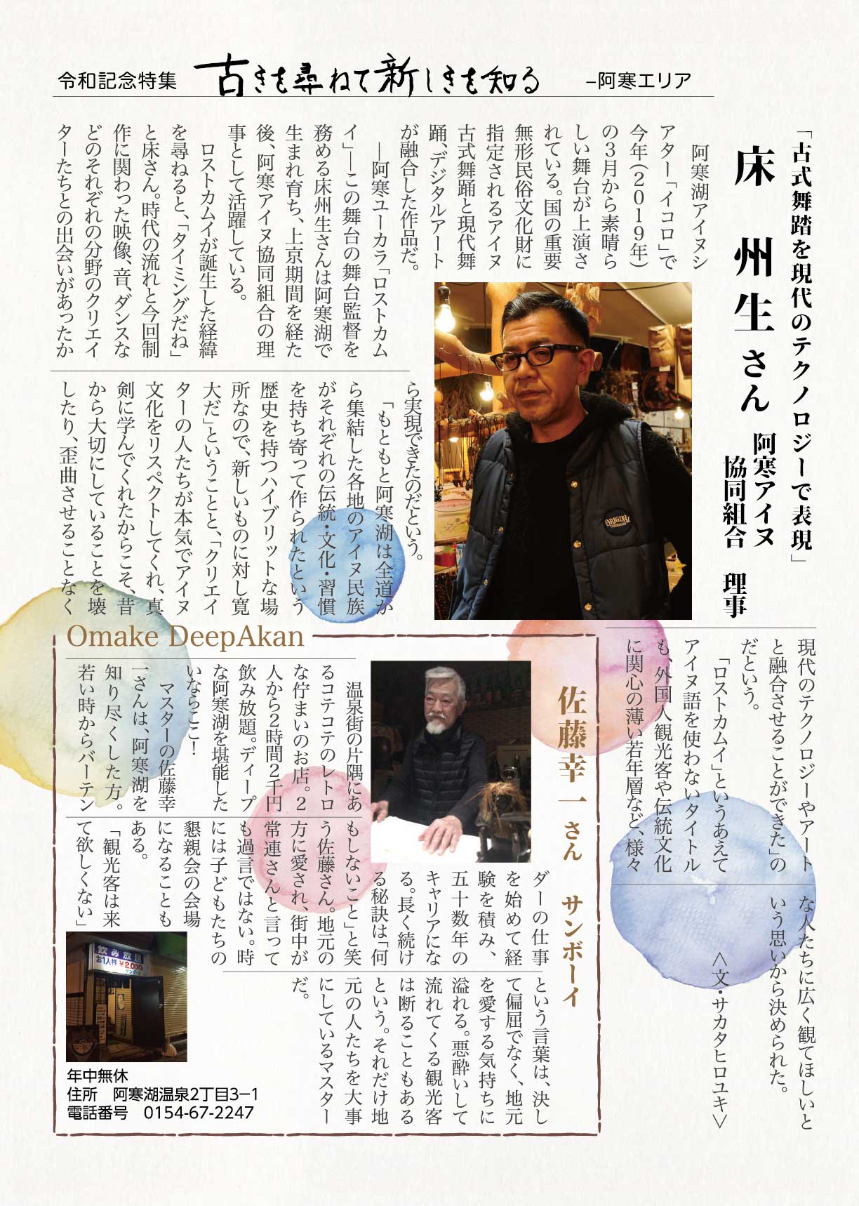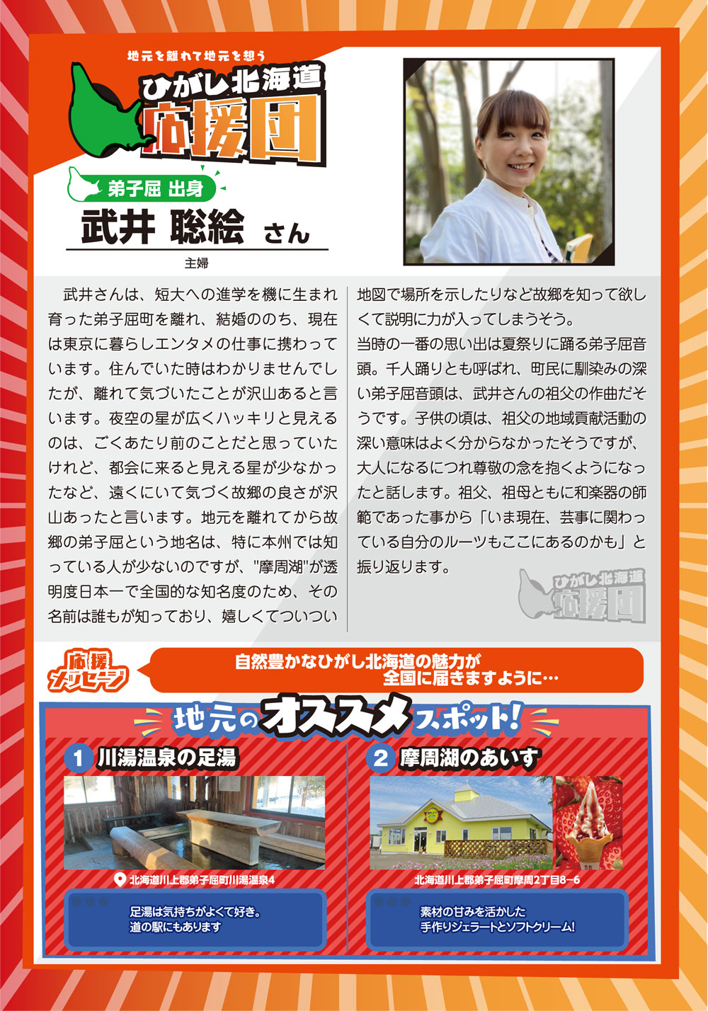 「スミの人NAVI」や「ひがし北海道エンジョイMAP」などの小冊子を通じて特集してきた様々なコーナーで紹介してきた方々をアーカイブ化しました。※クリックすると、記事をご覧いただけます。 ひがし北海道応援団 Youは何しにDOTOへ? 古きを尋ねて新しきを知る 釧路市出身 湊 理徳 思い出の場所は和商市場 弟子屈出身 武井 聡絵 思い出は夏祭りに踊る弟子屈音頭 阿寒町出身 白鞘 由真 ひがし北海道は、自分を作り上げてくれた原点 中標津町出身 エナ ものすごい自然が、当たり前のようにすぐそばにある 浜中町出身 グッチ 故郷の浜中や、釧路の光景を思い出す 釧路市 浦田 マルニー 「寒い」けど「暖かい」そんな釧路が大好き 弟子屈町 ベースラー・パスカル 夢は弟子屈での交流イベント開催 釧路市・阿寒湖畔 リー・ウンギョン アイヌの方々と出会い人生が変わった 中標津町 ローポンピパット・タナワット タイの人たちに自分の好きなものを知ってほしい! 釧路市 ティラック・ピーリス スリランカの健康文化を日本でも 鶴居村 松井 杉佳(アン) 故郷と似ている鶴居村がだいすき 懐かし館・蔵 中野 吉次 地域の文化を集めて 阿寒アイヌ協同組合理事 床 州生 古代舞踊を現在のテクノロジーで表現 朝市の会代表 大石 さくら 地域の遺産に活気と記憶をつなぐ バックナンバー 1 2 3